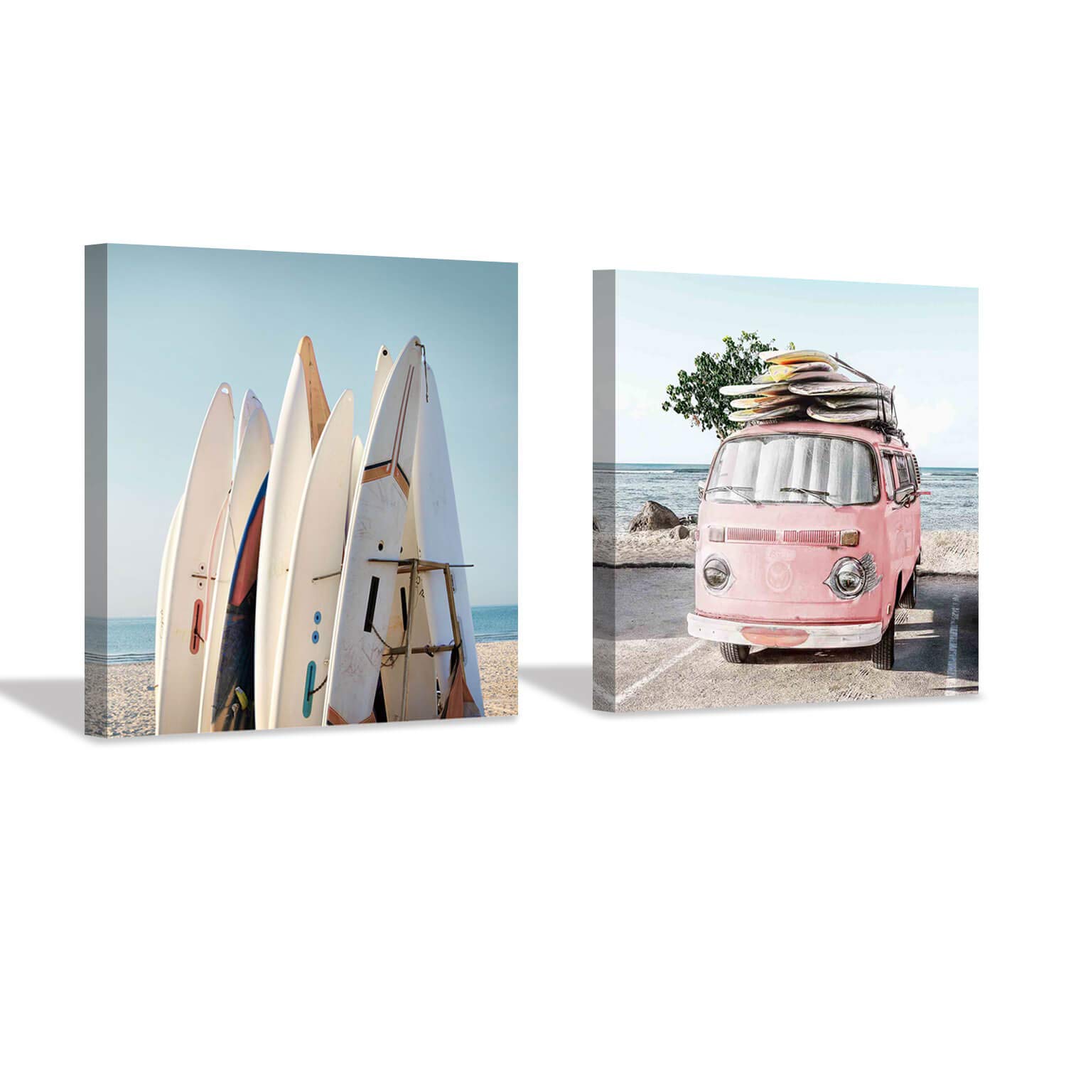 Beach Picture Coastal Wall Art: Surfboard & Pink Car Painting Ocean Wall Art on Canvas for Bedroom (16" x 16" x 2 Panels…- Buy Online in China at Desertcart. ProductId : 181793685.